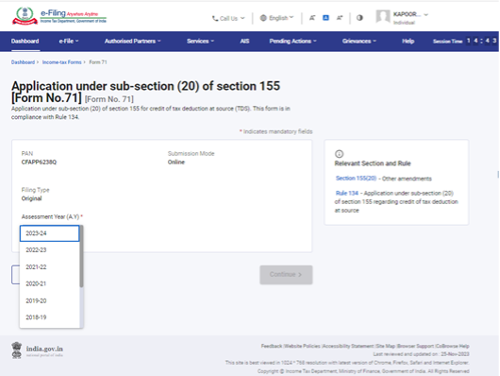- Select the Relevant Assessment year for which Form 71 is being filed
